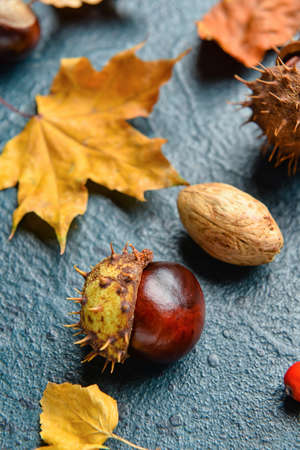 Chestnut and leaves, autumn time, dark tones