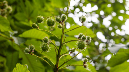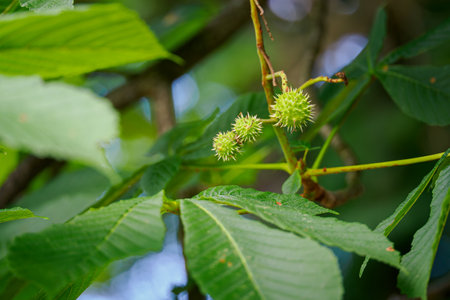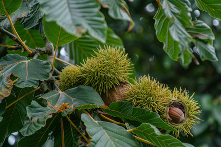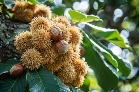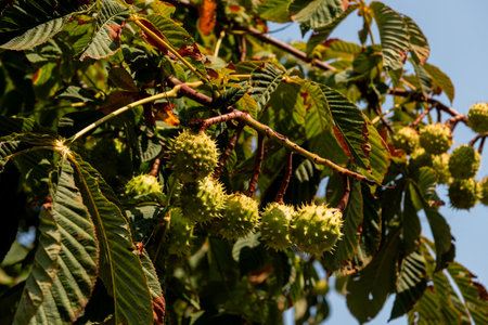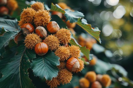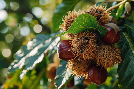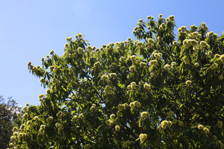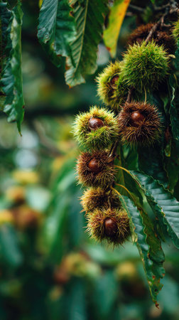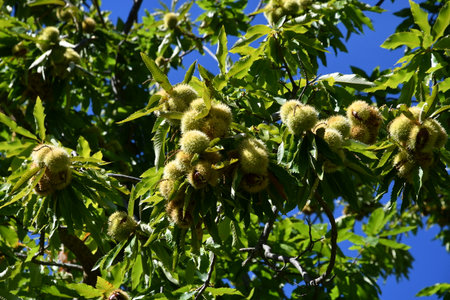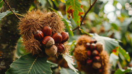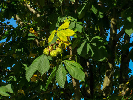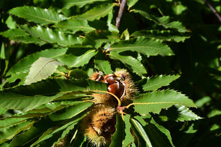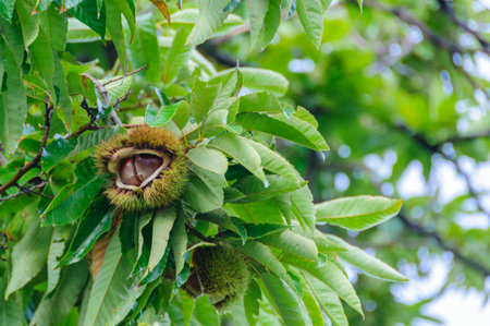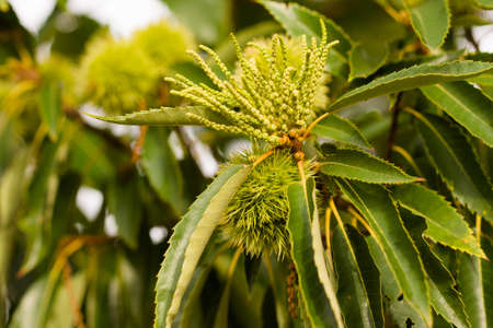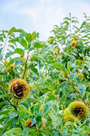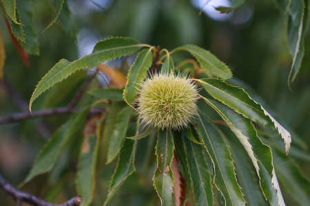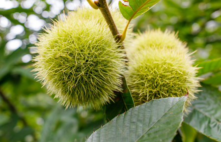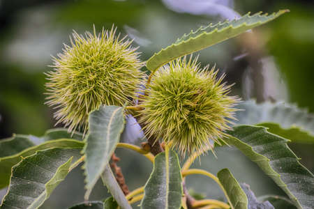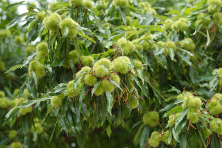 Castanea sativa ripening fruits in spiny cupules, edible hidden seed nuts hanging on tree branches, green leaves, brown tasty nuts in husks