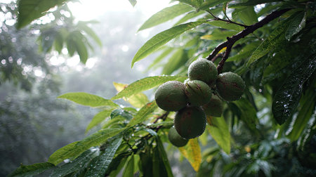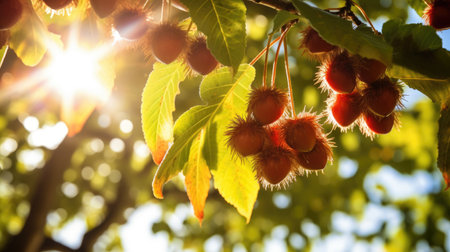 In a dense forest, spiky green fruits cluster tightly on a slender branch, embraced by vibrant green leaves. Sunlight filters through the foliage, creating a serene atmosphere.