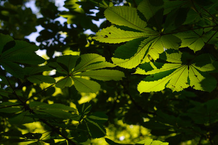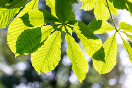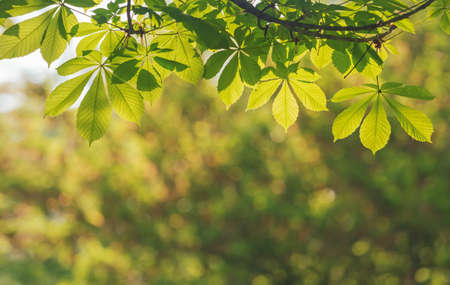 spring natural background. Green leaves of chestnut tree against the light.