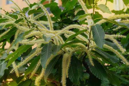 Castanea sativa is growing in garden. Blooming tree in park. Cottage garden. Sunny day.