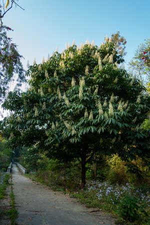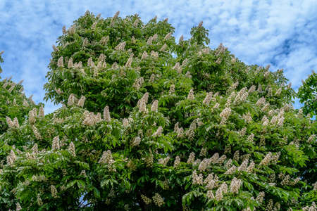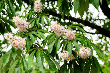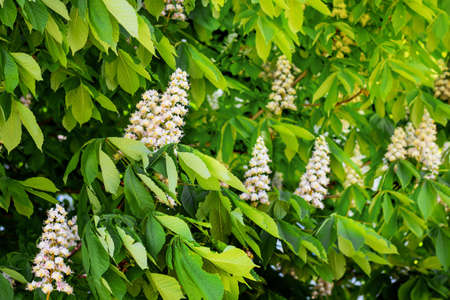 A shot of horse chestnut tree in full bloom with flowers, Aesculus species called buckeye
