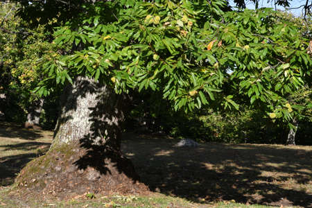 Fruto y semilla del castaño de indias o falso castaño, Aesculus hippocastanum al inicio del otoño