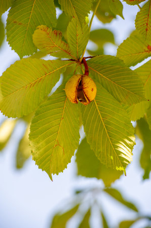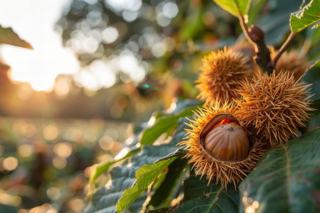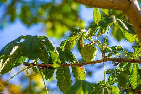 Ripe chestnuts on a branch in the rays of the sun