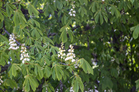 White flowers of chestnut among the green leaf. Chestnut bloom