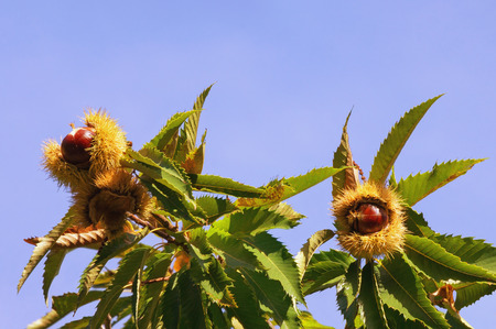 Autumn. Branch of chestnut tree with leaves and fruits against blue sky on a sunny day. Sweet chestnut ( Castanea sativa ), Mediterranean region