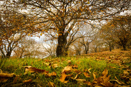 Autumn magic forest. From the ground, path full of chestnuts, It makes its way through the trees. Hervas, Spain.