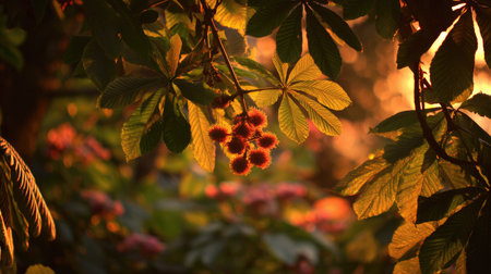 The Horse chestnut at sunset, Golden red sunset light filters through the leaves, still atmosphere, warm orange glow blending with natural green tones.