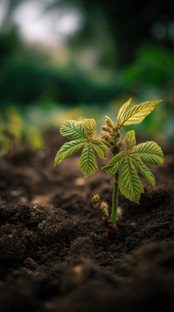 Horse chestnut with small fresh leaves, growing upright in fertile soil, sunlight filtering gently, realistic textures, vibrant green tones, natural photography style, wide balanced composition