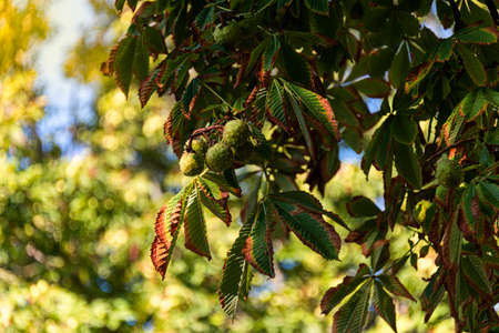 horse chestnut tree with autumn color showing conkers, autumn concept .close up;