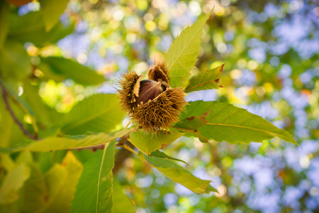 Chestnuts on the tree in the autumn garden. Shallow depth of field.