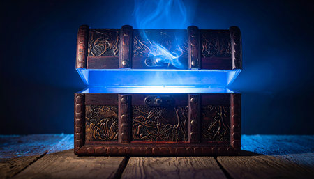 A mysterious wooden chest emitting smoke, illuminated by warm light, creating an atmospheric scene. Perfect for themes related to mystery, treasure, and history.
