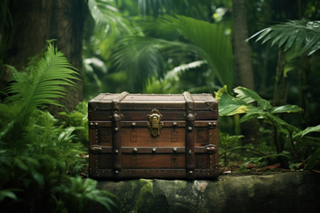 A beautifully crafted vintage wooden treasure chest, adorned with metal accents, set against a backdrop of lush jungle foliage. Perfect for themes of adventure, mystery, and exploration