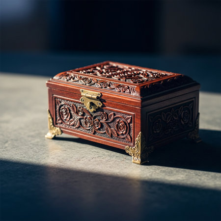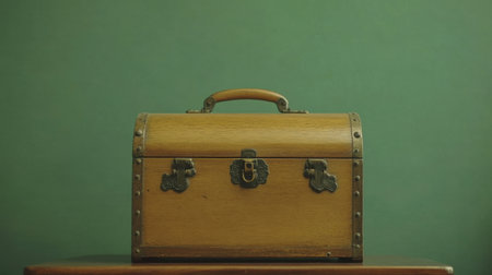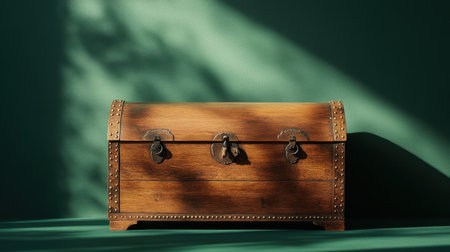 A rustic wooden treasure chest featuring elegant metal accents rests against a green background, showcasing the beauty of shadows and textures.