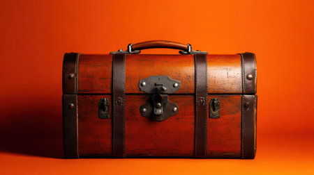 Elegant vintage leather baggage features a sturdy wooden frame and metal buckles, perfect for travel or decorative purposes against a vibrant orange backdrop.