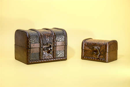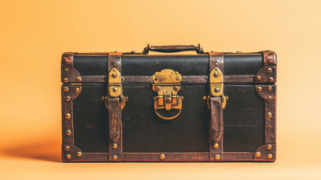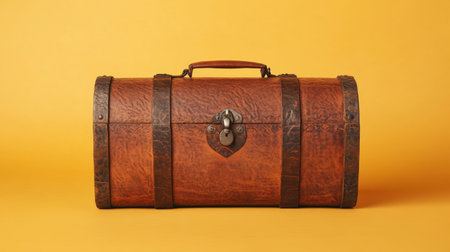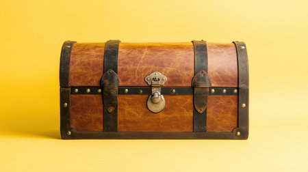 This vintage leather treasure chest features decorative metal hardware and a secure latch, perfect for storage or display. The warm yellow background enhances its timeless appeal, making it an ideal piece for home decor or as a unique gift.