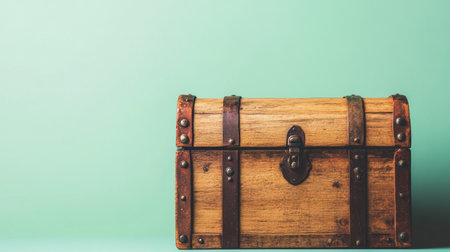 This vintage wooden treasure chest features sturdy metal accents, set against a soft green background, perfect for decorative, artistic, or nostalgic themes.