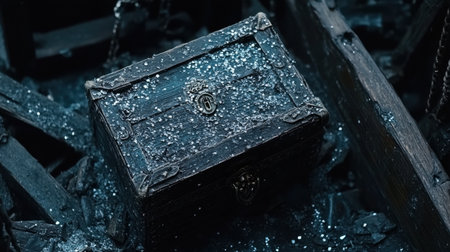 An exquisite antique treasure chest sits amidst dark debris, reflecting sparkles and mystery. The scene evokes a sense of exploration and adventure.