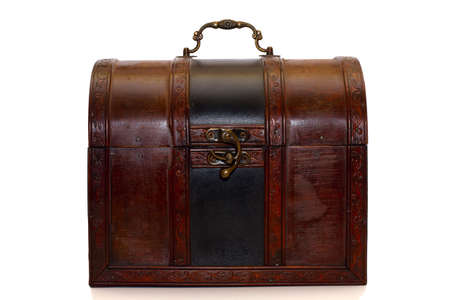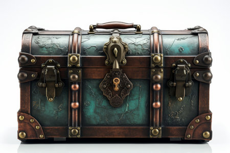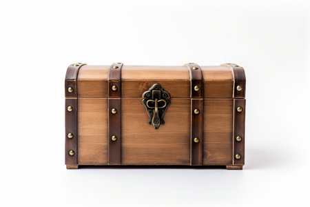 Detailed photo of a vintage wooden chest with metal accents isolated on a white background, symbolizing treasure and history
