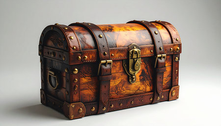 An old, ornate wooden treasure chest, bound with leather straps and secured with a brass latch, sits isolated against a plain background.