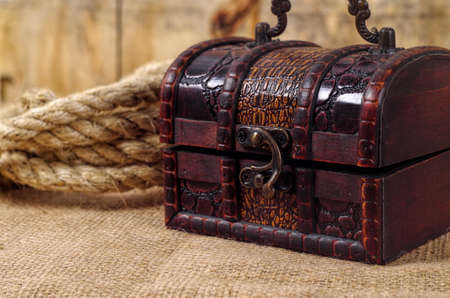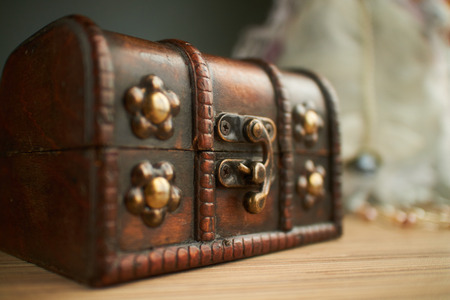 A dark wooden treasure chest with lid closed on wooden table. Selective focus