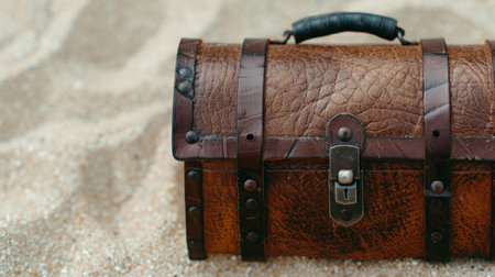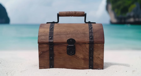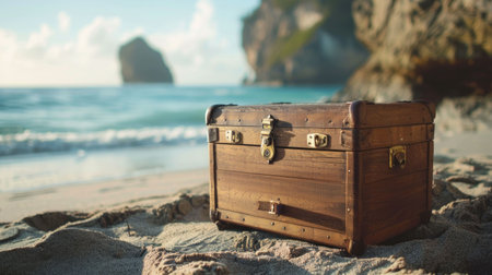 vintage wooden treasure chest on sandy beach, ocean waves, sunny day, rock formations, vibrant colors, adventure concept, relaxation, exploration, warm tones, natural scenery, atmospheric image