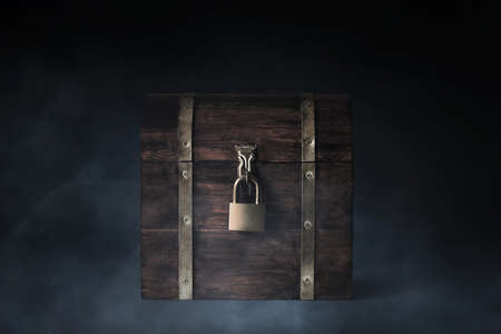 Wooden chest with chain and lock on dark background. Selective focus. Toned.