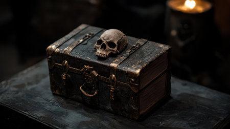A beautifully crafted antique treasure chest topped with a skull, resting on a dark surface. The candlelight adds an eerie glow, enhancing the mystery and allure.