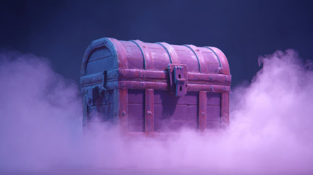 A wooden treasure chest emanates mystery, surrounded by vibrant smoke and mist. This atmospheric scene invites imagination and adventure in a fantasy world.