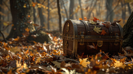 Illustrative scene of a treasure chest half-buried beneath fallen leaves in a serene forest, capturing the allure of hidden treasures in nature's embrace