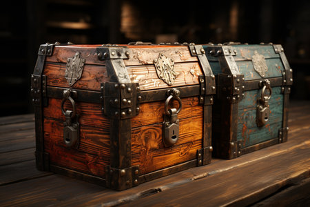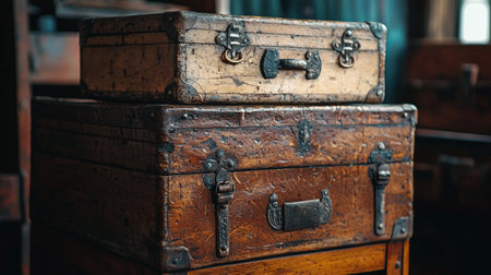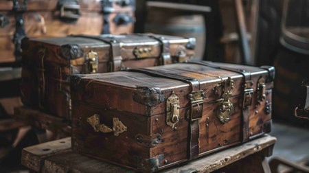Antique wooden trunks with metal clasps in a vintage setting, showcasing historical and rustic charm, ideal for retro and nostalgic themes.