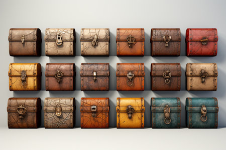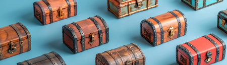 Vintage Treasure Chests Collection on Teal Background Antique Wooden Trunks, Varied Old Fashioned Lockable Boxes, Retro Storage Concept AI Generative