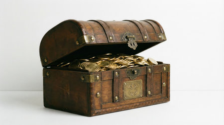A chest filled with coins, it is ajar from it. Coins scattered in the background, a spyglass is visible, everything is on a white background. Brown wooden box Wealth income earnings saving money