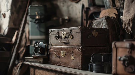 A vintage brown leather suitcase placed on a wooden table next to an old camera and various travel items, evoking a sense of nostalgia and adventure in a rustic setting.