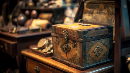 An aged wooden treasure chest is the central focus, showcasing ornate metal detailing. The chest sits atop a surface, illuminated with soft lighting. A blurred background suggests a warm, inviting setting. This image is suitable for various commercial uses, including historical themes or concepts of wealth.