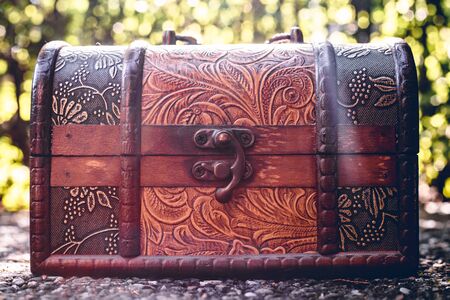 Wooden mystery box with fine beautiful carvings and decorations placed on the ground in nature with a blurred background – Small chest for storing jewelry