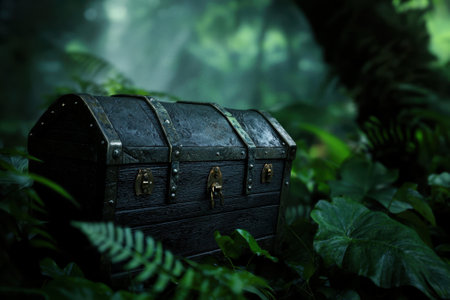 Nestled in the heart of a vibrant forest, this treasure chest rests among ferns, bathed in soft morning light, evoking a sense of mystery and hidden treasures waiting to be discovered.