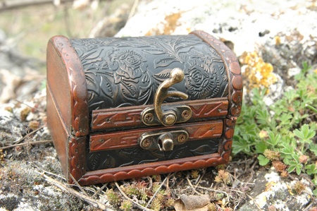 An aged treasure chest, featuring intricate metalwork and wooden construction, rests on a textured rock. The chest displays shades of brown and gray, with visible details. The scene suggests an outdoor setting with diffused lighting. It is suitable for commercial uses, including illustrations and editorial projects.
