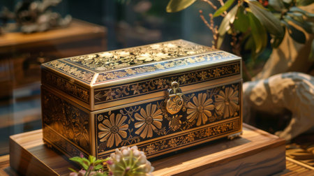 elegant jewelry storage, a lavish gold jewelry box with intricate floral designs and a lock for security, making it a beautiful addition to any vanity