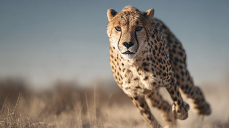a powerful wildlife photograph capturing a cheetah mid-run in the african savanna. the animal is focused on the camera, demonstrating its speed and intensity in the dry grassland under a clear sky, highlighting conservation and natural beauty.