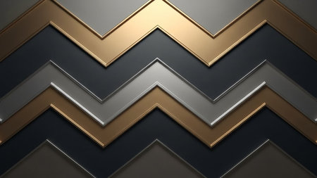 A luxurious abstract background featuring a 3D chevron pattern in gold, silver, and dark gray metallic tones.