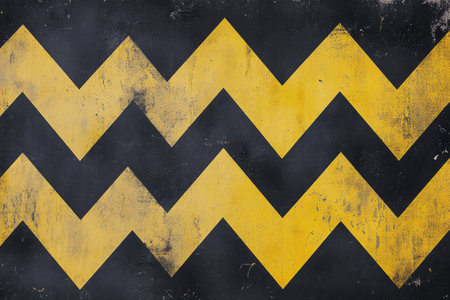 A bold yellow zigzag pattern spans across a textured black wooden surface, creating a striking visual contrast.