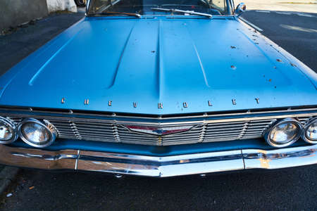 Ramsgate, United Kingdom - June 10, 2021: The hood and grille of a 1961 Chevy Bel Air