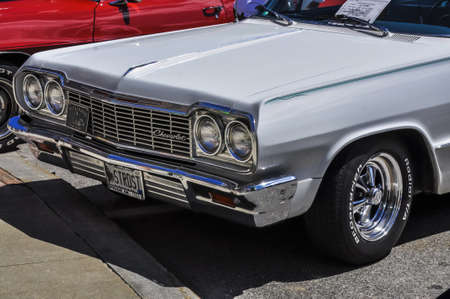 Bangkok Thailand - JAN 7th 2016: classic american cars, in Train Market ,on JAN 7th 2016. Front view of Black car, Chevrolet Impala of 1959 Logo