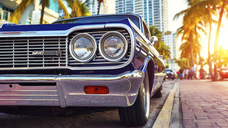 A vintage car parked in the street with rays of sunlight created with Generative AI
