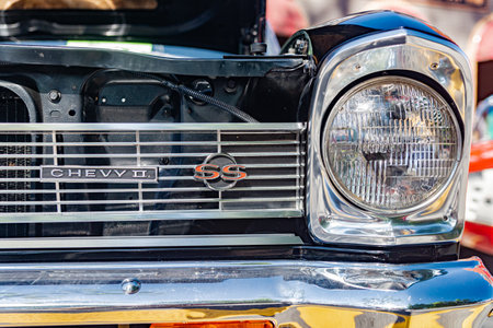 NORDLINGEN, GERMANY - APRIL 29, 2017: Chevrolet Bel Air oldtimer car at the MotoTechnika oldtimer meeting on April 29, 2017 in Nordlingen, Germany. Close-up of the hood and front emblem.