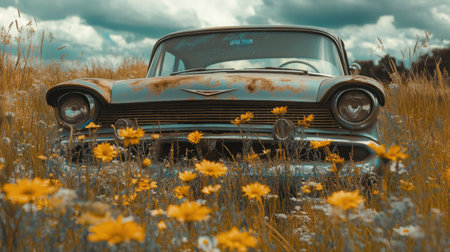 Classic car abandoned in a field of tall grass and yellow daisies, nature slowly taking over