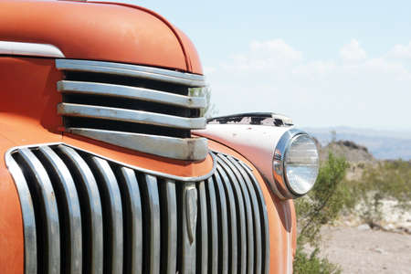 Bright red old classic antique American car half front part, glass headlights side signals lights lamps and shine chrome bumper, in perfect conditions