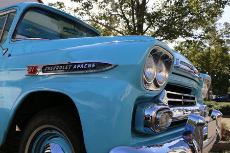 Detailed shot of an old blue Chevrolet Apache built in the 1950s (Mutterstadt, Germany, August 16, 2019)