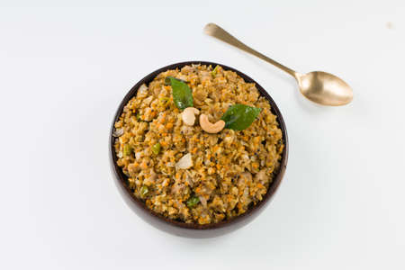 Aval upma or poha upma or kanda poha upma,healthy indian breakfast item which is very tasty and easy to cook and it is arranged in a wooden bowl with white textured background.